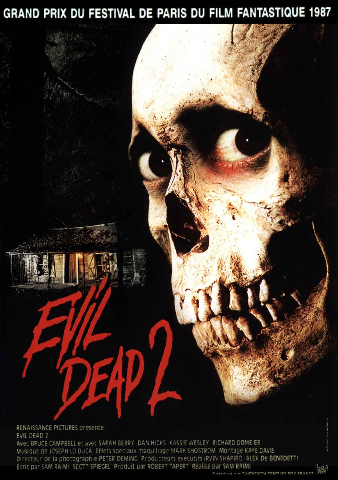 On retrouve évidemment Bruce Campbell, acteur au faciès changeant, jouant la démence avec une précision redoutable, malmené physiquement de bout en bout et restant le héros culte de cette saga mythique. Au ton carrément d’épouvante d’Evil Dead 1, cette suite répond par une approche opposée, clairement moins sombre, assumant ses délires visuels, et se « moquant » au passage de classiques comme Massacre à la tronçonneuse notamment dans les longues séquences où Ash se défend avec une tronçonneuse vissée sur son bras et débitant les figures maléfiques avec délectation. Sam Raimi a compris que tant qu’à faire un film « jumeau », autant les rendre aussi bien différents.