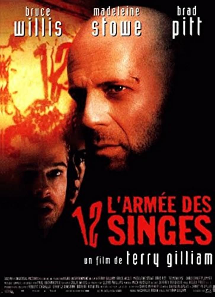 L’année 2035 n’est pas gaie. L’humanité a presque entièrement disparu, décimée par un mystérieux virus. Quelques survivants se terrent dans des catacombes. L’un d’eux, James Cole, est expédié directement en 1996, année du cataclysme, afin de comprendre l’implication dans l’affaire d’une mystérieuse organisation, l’Armée des douze singes. Cole espère aussi percer le mystère du rêve qui le hante depuis l’enfance: la mort violente d’un homme dans un aéroport. Un rêve prémonitoire?