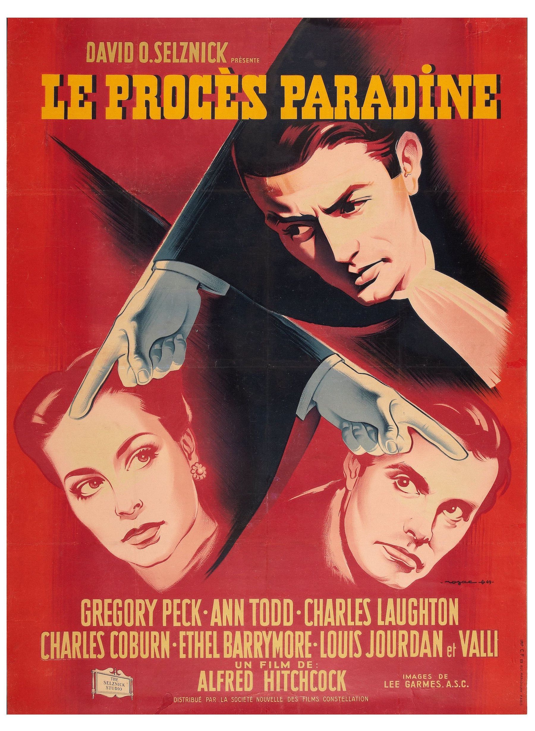 L’association entre Alfred Hitchcock et David O’Selznick, démarrée avec Rebecca, arrive à son terme avec Le Procès Paradine, film de procès comme son titre l’indique autour de la figure d’une suspecte pleine d’ambiguité. Les relations entre le producteur et Sir Alfred sont devenues excécrables avec le temps et le tournage ne fut pas de tout repos. La qualité globale du métrage s’en ressent nettement: trop longue, la première partie se traine entre dialogues bavards, scènes peu folichonnes avant qu’Hitch ne rectifie le tir dès lors que l’action se déroule dans la Cour d’Assises, où il peut mettre à profit son sens de la mise en scène. Mouvements d’appareils acrobatiques, mise en valeur du texte, soin apporté aux costumes (Laughton et Peck en habits de juge et d’avocat), et suspense maintenu jusqu’au bout sur l’issue des débats. Au fond, l’auteur de Psychose parait pris entre deux feux: celui de satisfaire les exigences de la production lui réclamant davantage de péripéties autour du dilemme amoureux des personnages et celui de se cantonner à un film policier de facture classique. Le Procès Paradine contient ainsi de bonnes choses, des moments réussis et d’autres largement plus faibles.