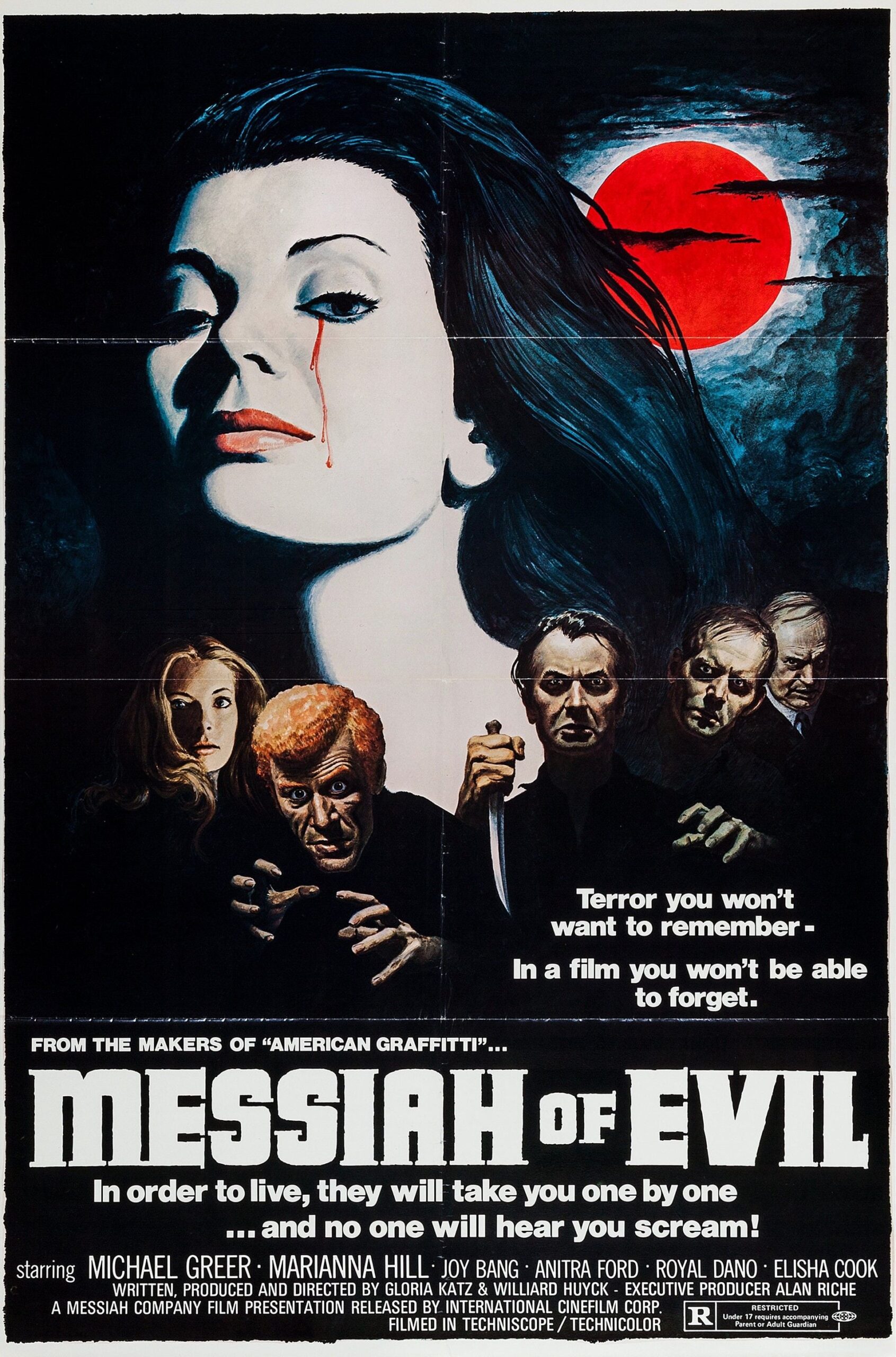 Voici un des films d’horreur américains les plus méconnus du début des années 70. Messiah of Evil, réalisé avec un budget ultra limité, est l’œuvre de deux scénaristes (William Huyk et sa femme Gloria Katz) et ne ressemble à rien de connu jusque là. Avec ses habitants d’un village isolé non loin de San Francisco semblant pour la majorité touchés par une sorte de « pourrissement intérieur », le film pourrait se rapprocher dans l »esprit du fameux Romero La Nuit des Morts Vivants , avec une touche très personnelle. Les images baignent dans un onirisme constant, la photographie entretient une étrangeté inquiétante, soutenant une atmosphère flippante. Volontairement assez lent dans son intrigue, il contient des séquences étonnantes ne manquant pas d’idées (entre autres celle où une jeune femme se rend dans une salle de cinéma presque vide, qui se remplit peu à peu par des spectateurs mutiques qui ne veulent pas juste consommer du film!). On pense à plusieurs grands classiques du cinéma d’horreur tels que Fog, Zombie ou Le Loup Garou de Londres, sauf que ces titres sortiront bien des années plus tard. Messiah of Evil semble également influencé par le style de Mario Bava, auteur de La Baie Sanglante, avec ses dominantes de rouge et de bleu. Proche d’un cauchemar éveillé digne d’un récit de Lovecraft, le film surprend par sa maîtrise de mise en scène (surtout pour un premier travail de cinéastes débutants) et l’aspect insolite de son déroulement..